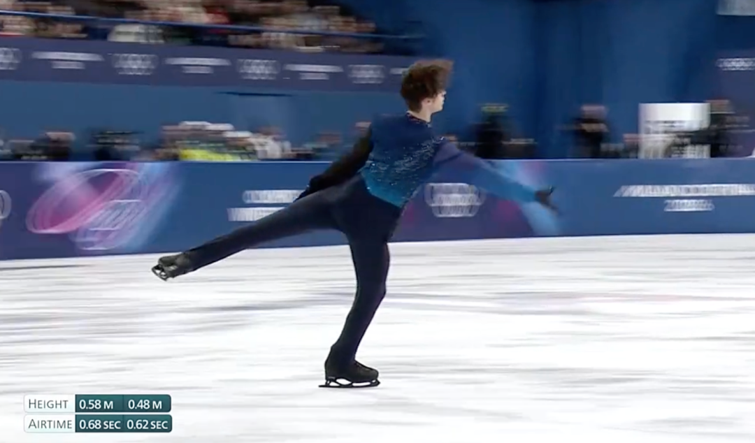 起跳瞬间垂直向上的速度决定了跳跃高度,同时也决定了滞空时间。高水平运动员在起跳时垂直速度更大,这让他们能在空中停留更久,有时间转完更多圈数。顶尖花滑选手能达到的最大腾空时间大约在0.7秒左右[1]。