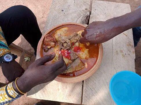 你在抖音上看过这种非洲吃播吗:盘子里满满装着有菜有肉的丰盛炖菜,旁边放着一团白色、略似馒头又好像更柔软的食物;主播揪下来一小坨白色,在炖菜里蘸一蘸,再用手而非餐具送入口中……