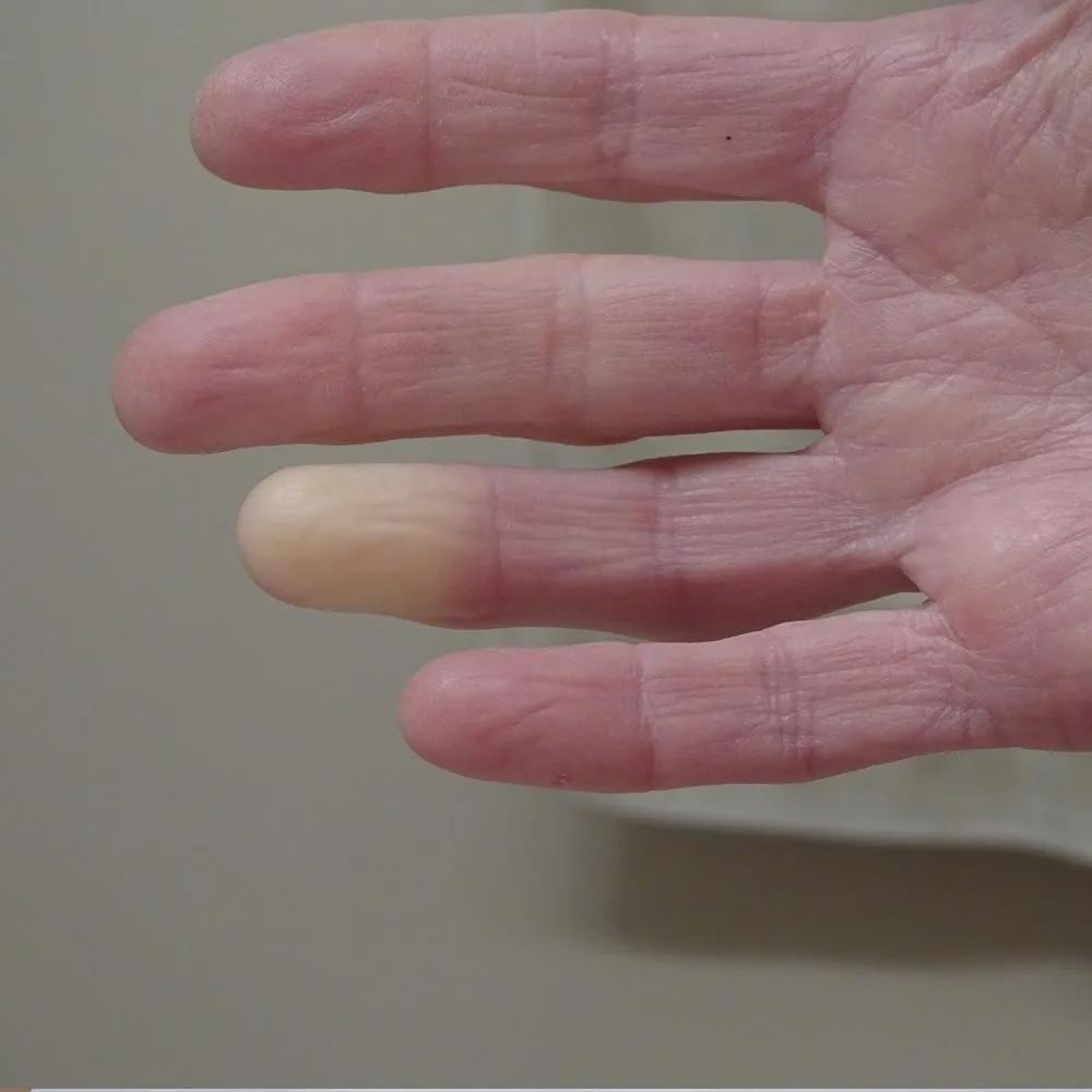 他记录了25个病例,其中一位女性的手指在寒冷或情绪激动时会突然变得像死人一样苍白,随后变成青紫色,最后又在剧痛中变红 。