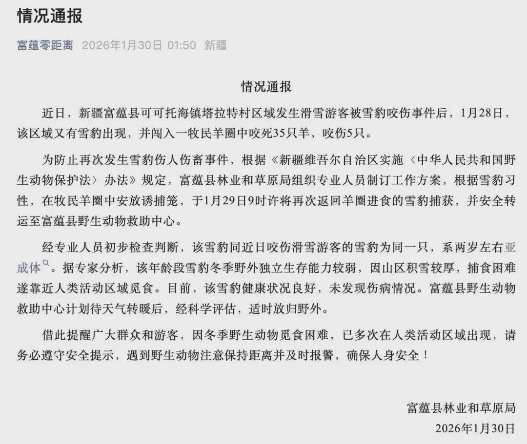 前一阵子,新疆可可托海雪豹伤人的事件登上了热搜。在该事件报道后没多久,当地有关部门发布通告,有牧民的羊遭到雪豹袭击,共有35只羊被咬死,5只被咬伤,在将涉事雪豹捕获后,有关人员初步判断该雪豹与伤人雪豹为同一个体。