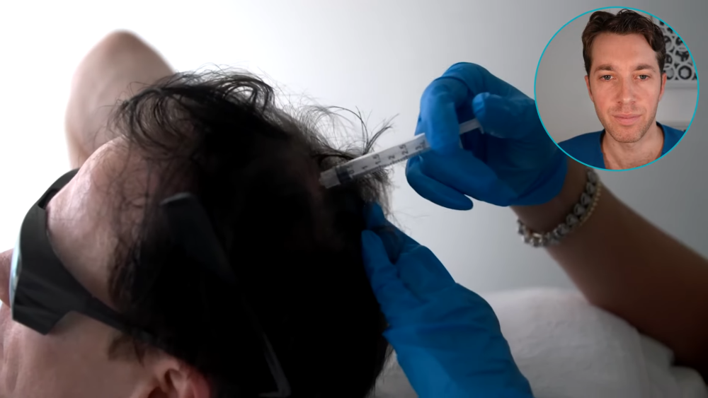 布莱恩在对自己的头皮用外泌体,右上角对此操作面露痛苦之色的是Ross Kopelman医生。