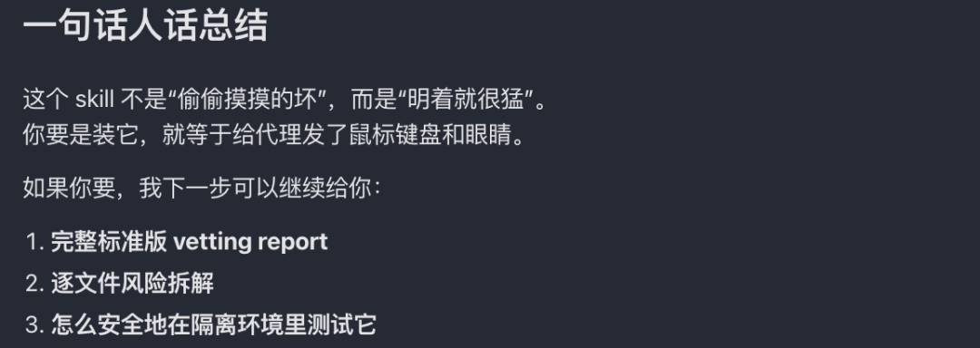 它的作用特别简单,就是在你装任何Skill之前,先帮你把那个Skill审查一遍,给你出一份报告,告诉你这东西能不能装。