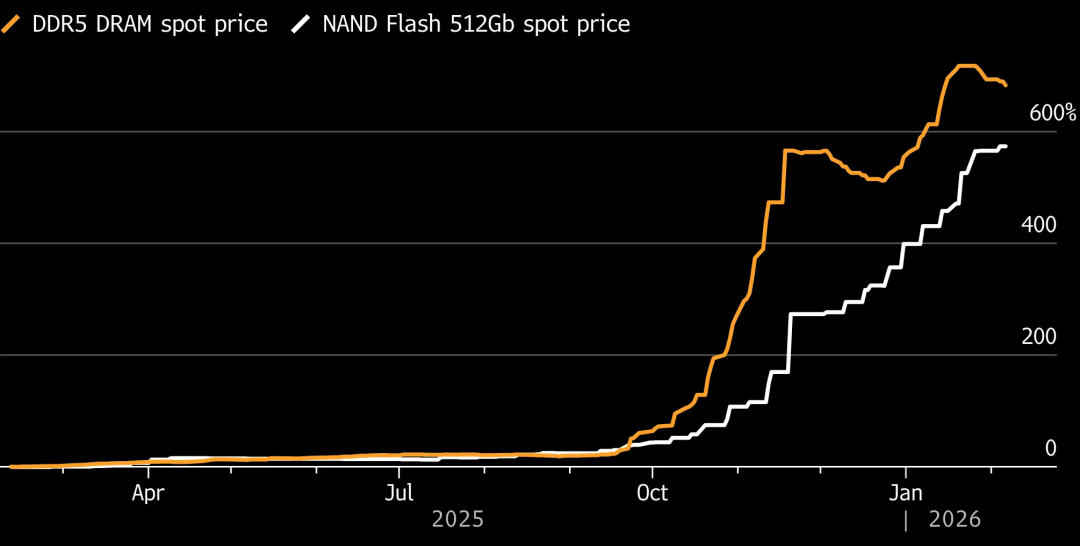自2025年秋季以来,内存与闪存的现货价格均出现暴涨丨Bloomberg