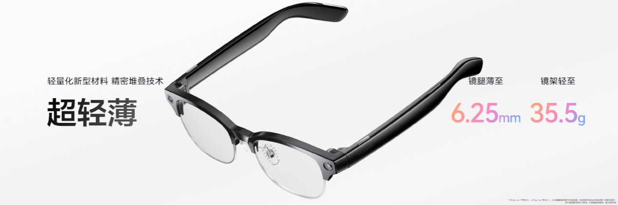 华为AI 眼镜采用轻量化材质与精密堆叠工艺,整机重量仅 35.5 克,镜腿薄至 6.25 毫米,引领AI眼镜超轻设计。产品基于对亚洲30万+头型特征数据的分析,构建了“黄金三角平衡架构”,实现均衡配重。并且搭配钛合金恒力铰链与三面环抱式设计,佩戴更加稳固贴合,可满足全天候舒适佩戴需求。