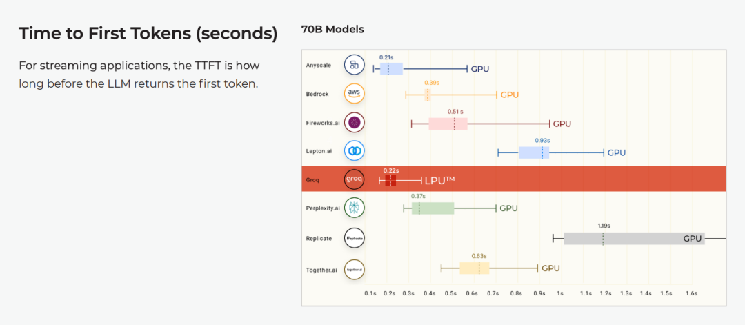 Groq LPU 在 Llama 2 70B 模型上取得了 185 tokens/s 的输出吞吐量,相比榜单上其他 GPU 方案实现了 3 到 18 倍的领先优势;同时首字响应时间 (TTFT) 稳定在 0.22 秒,且变化范围最小。这意味着 LPU 不仅在端到端推理速度上显著领先,更重要的是——每一次响应都同样快速、可预测。