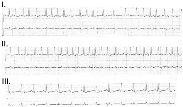 患者在直肠指检前(I,II)和直肠指检后(III)的心电图。丨Ruan, 2010.