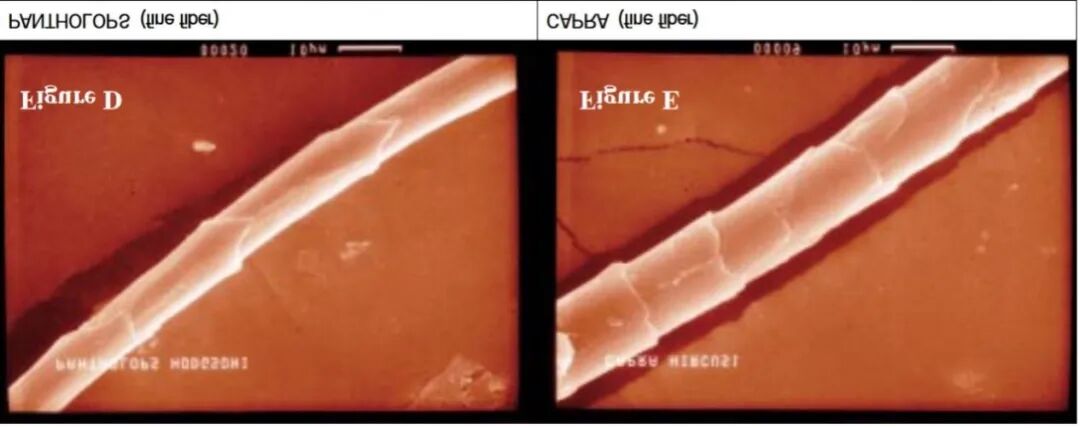 左为电镜下的藏羚羊绒,右为羊绒 | Wikipedia